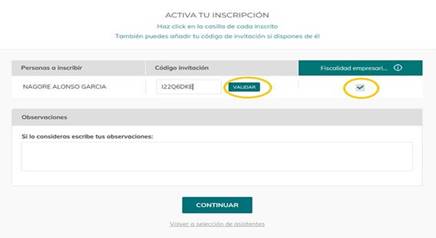 Para las personas que disponéis de un código de invitación. Debéis de incluirlo, validarlo y chequear en el cuadradito del título de la actividad (esto último para todo el mundo) como aparece en las imágenes adjuntas: