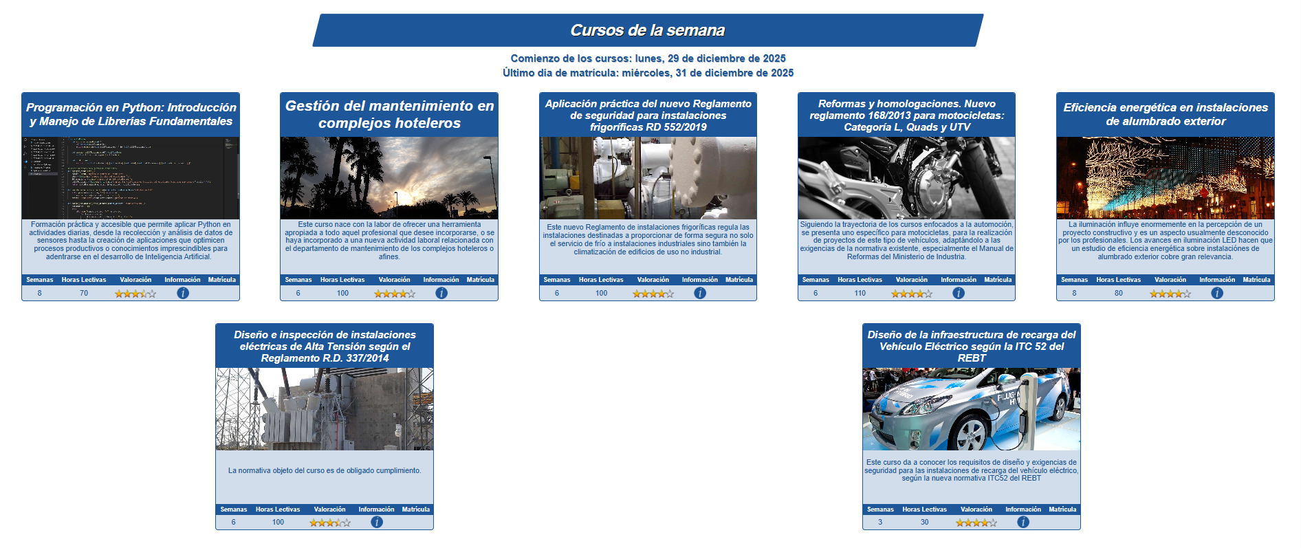 Boletín de Cursos de la Plataforma de Formación Virtual Ingenieros Formación - Semana 01/2026 Este boletín proporciona la información de los cursos de la Plataforma de Formación Virtual https://www.ingenierosformacion.com que tienen abierta su matrícula esta semana. Nos gustaría informaros... Gehiago irakurri