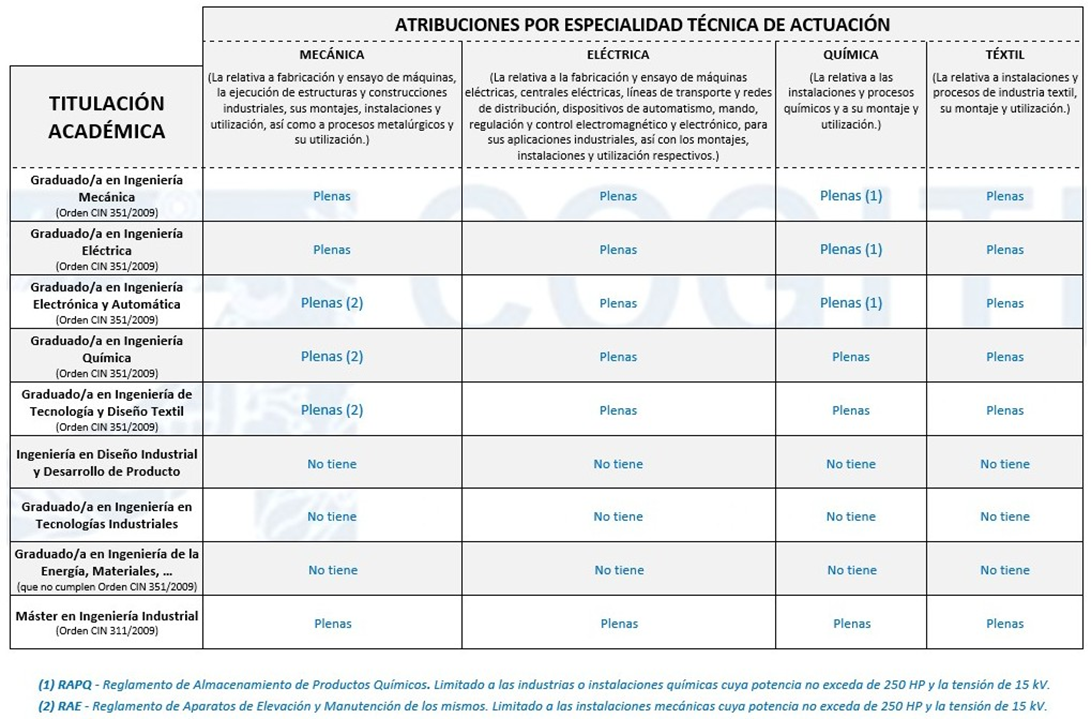 Por tanto, las atribuciones de los Ingenieros Técnicos Industriales y ahora de los Graduados en Ingeniería del ámbito industrial que cumplen la Orden CIN 351/2009, son plenas en su correspondiente tecnología específica y en el resto del ámbito industrial, pero con algunos límites tal y como se indica a continuación:
