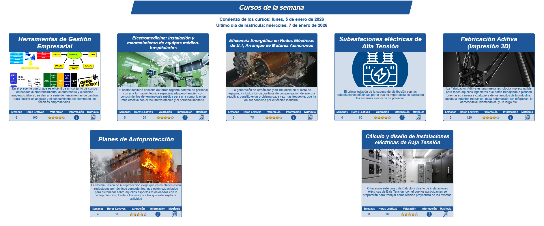 Boletín de Cursos de la Plataforma de Formación Virtual Ingenieros Formación - Semana 02/2026 Este boletín proporciona la información de los cursos de la Plataforma de Formación Virtual https://www.ingenierosformacion.com que tienen abierta su matrícula esta semana. Nos gustaría informaros... Leer más